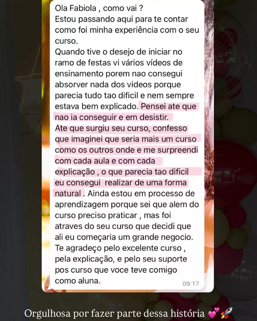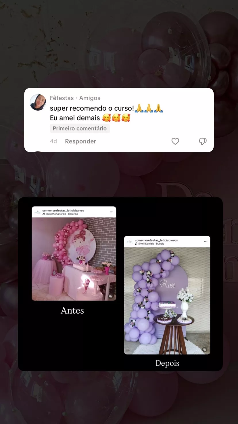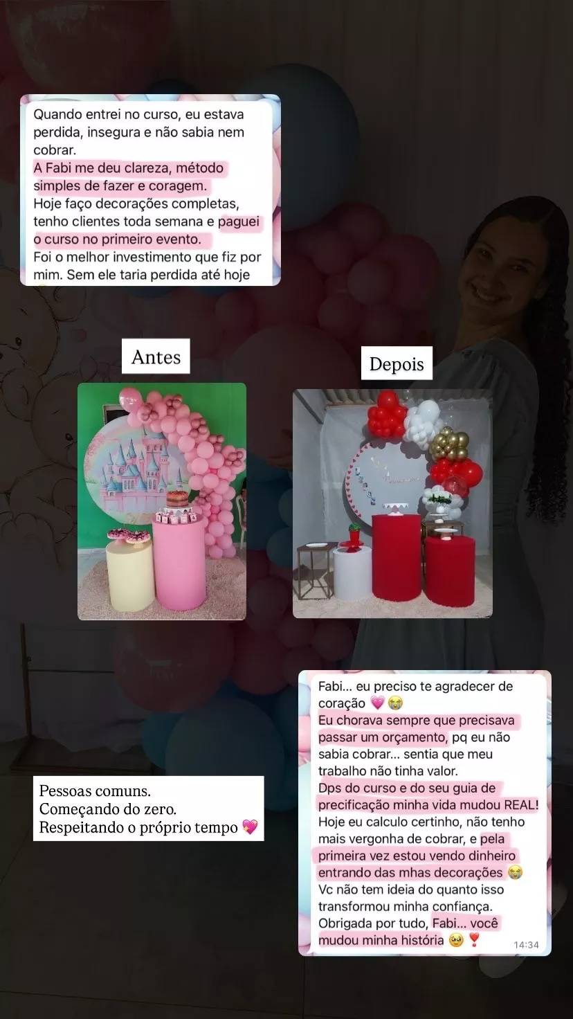 Hoje, ensino mulheres a darem os primeiros passos no mercado de festas do jeito certo — com clareza, técnica e segurança.